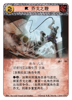 :如果所附属角色参与进攻,横置乔戈之鞭,重置一名角色并移出当前争夺。(如果所附属角色是乔戈,则最多重置两名。)