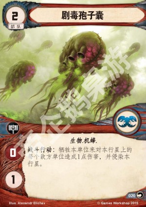 文本战斗行动:牺牲本单位来对本行星上的每个敌方单位造成1点伤害,并侵染本行星。